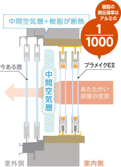 今ある窓とプラメイクとの間に生まれる中間空気層で、外気温の影響が受けにくくなります。さらに枠・障子は熱を伝えにくい樹脂製なので、結露の発生を軽減します。
