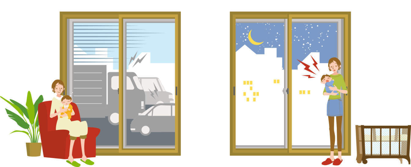 | Q: 近隣を走る車の騒音が気になるし、子供の騒ぎ声が近所迷惑になっていないか不安。 | 二重の窓で防音できます。−「 防音効果」 |