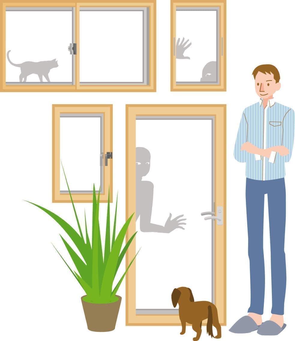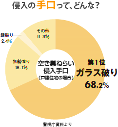 侵入の手口で最も多いのが「ガラス破り」です。外窓と後付樹脂内窓で二重窓にすることで、外窓のみの場合より、破壊を手こずらせます。侵入者は、5分以上侵入に手こずれば、諦める確率が高くなりますので、侵入を防ぐ効果が期待できます。